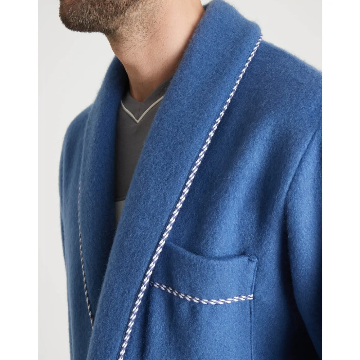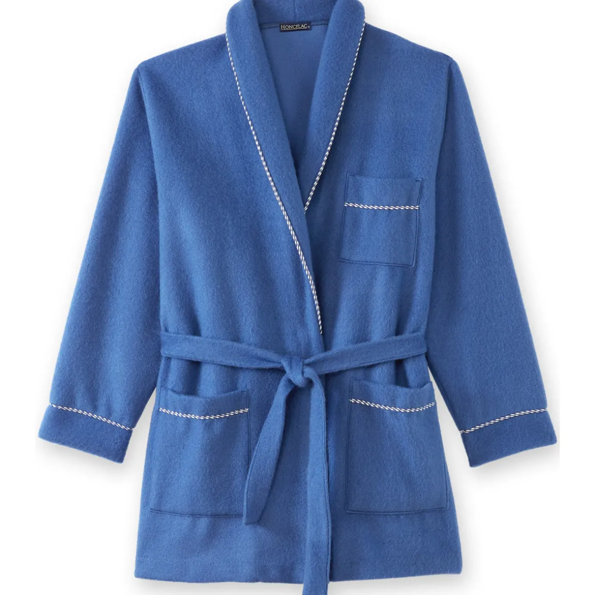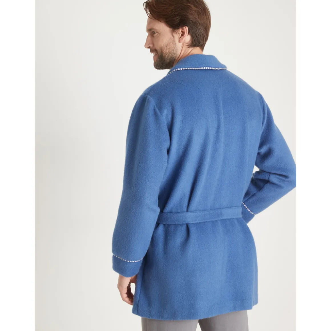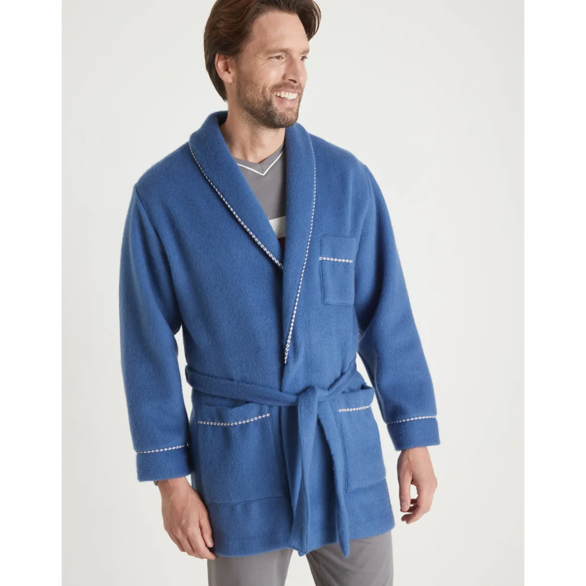 Robe de chambre : très douillette et bien chaude. Col châle et bas des manches soulignés d’une ganse contrastante. 2 poches plaquées. Poche poitrine. Ceinture sous passants à nouer. Longueur 115 cm environ. Lavable machine.Photo retouchée