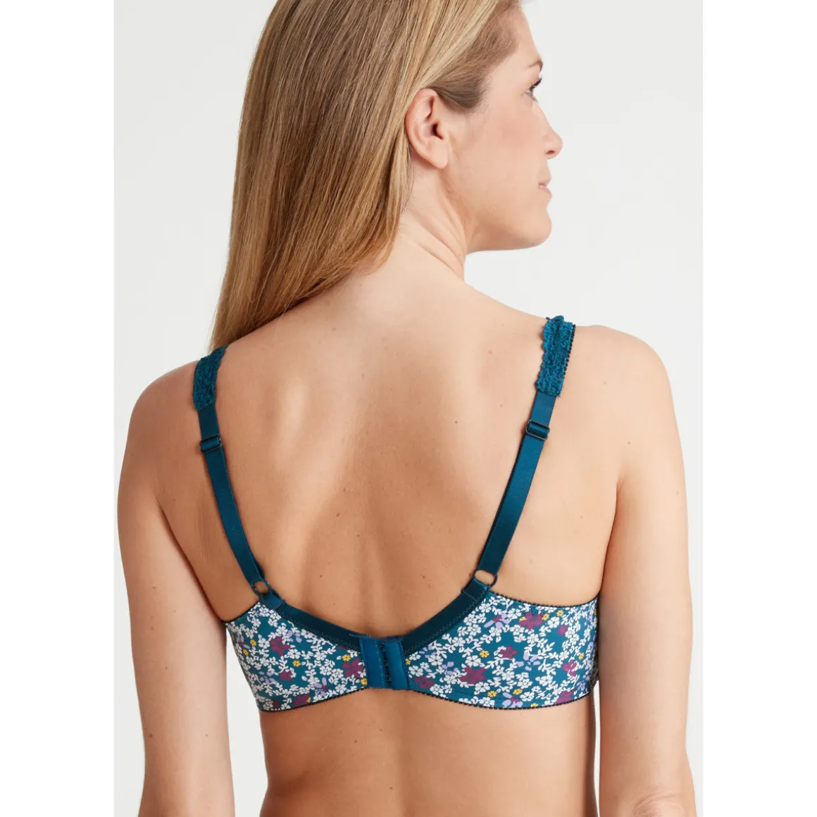 Bonnets 3 parties soulignés de dentelle délicatement travaillée remontant sur les bretelles réglables dos, maille charmeuse dans le bas. Nœud à l’entre-bonnets. Double agrafage dos 3 positions.
