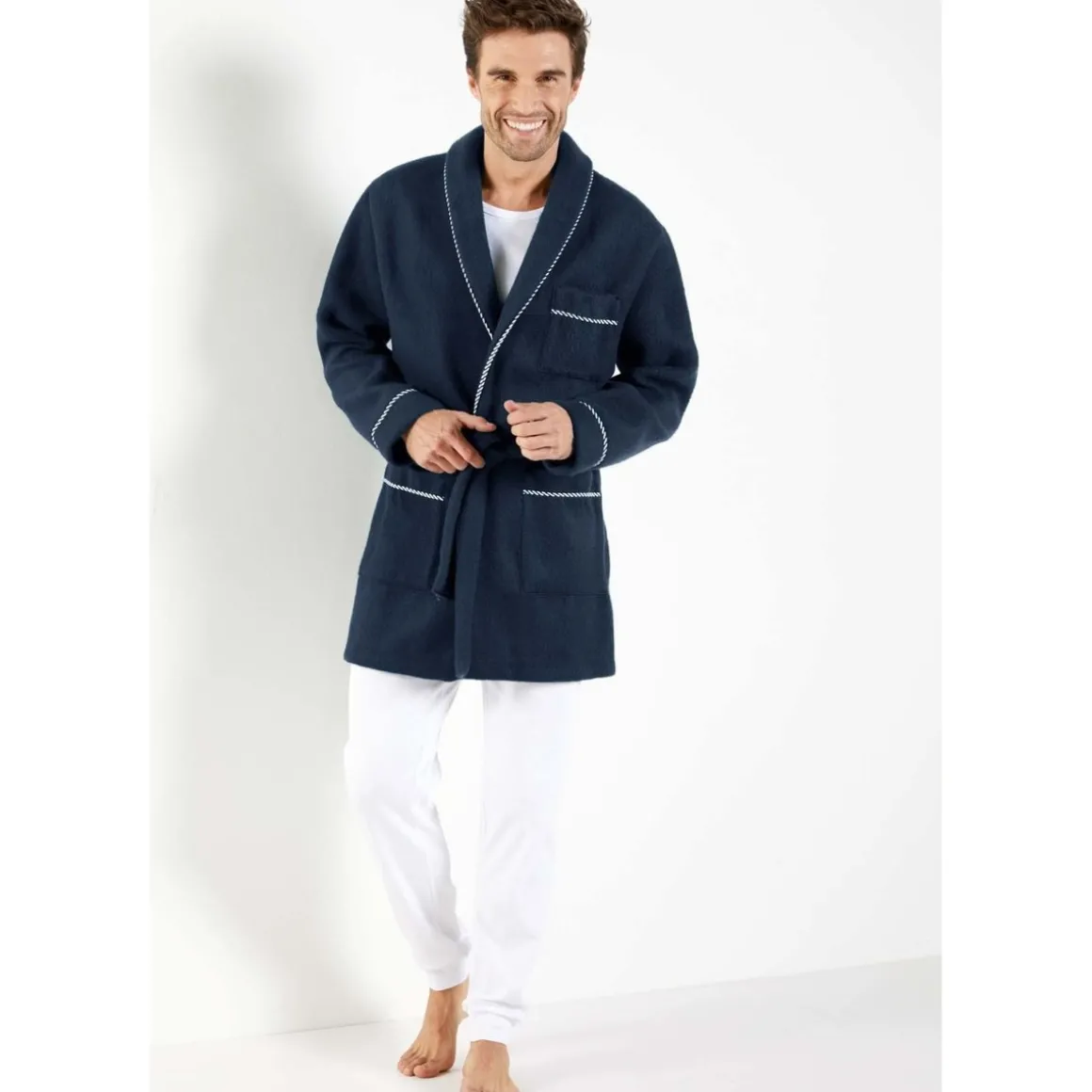 Une veste d’intérieur très douillette et bien chaude. Col châle et bas des manches soulignés d’une ganse contrastante. 2 poches plaquées. Poche poitrine. Ceinture sous passants à nouer. Longueur 90 cm environ. Lavable machine.Photo retouchée