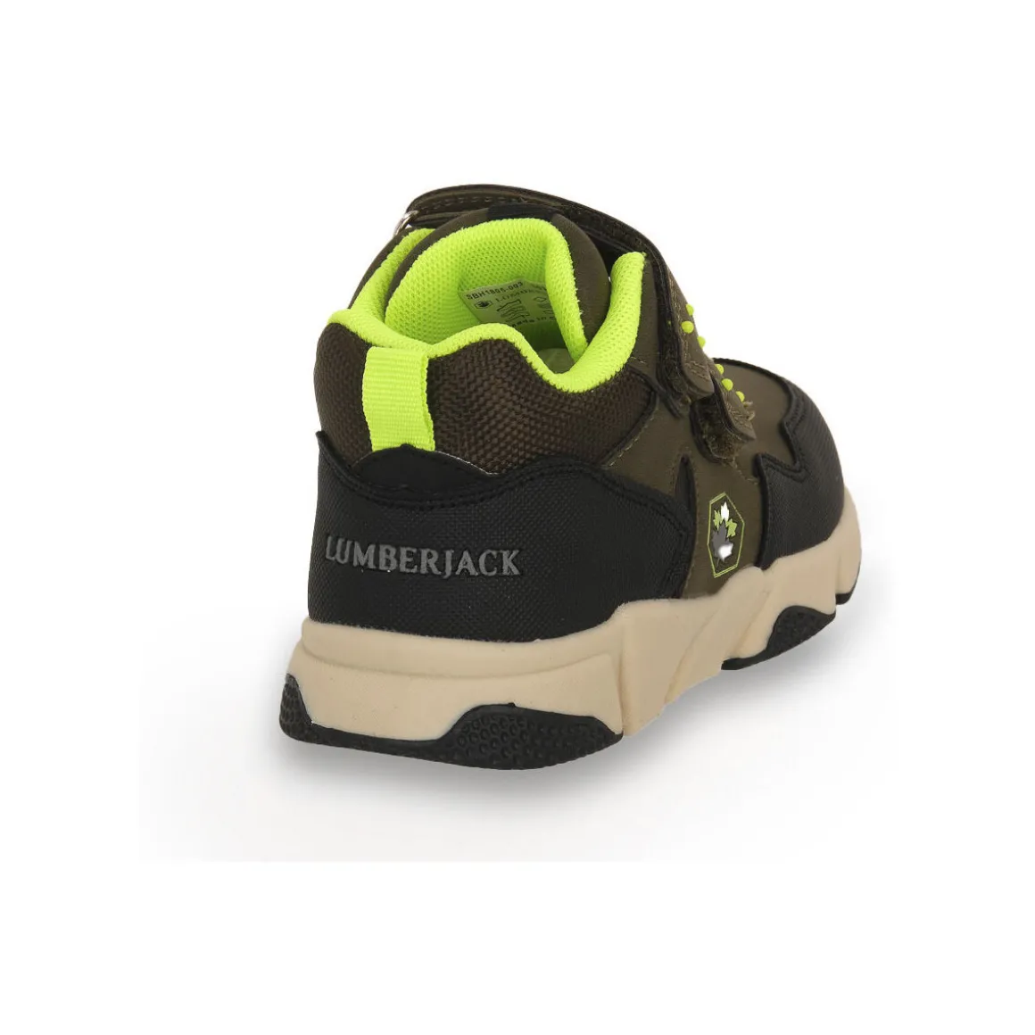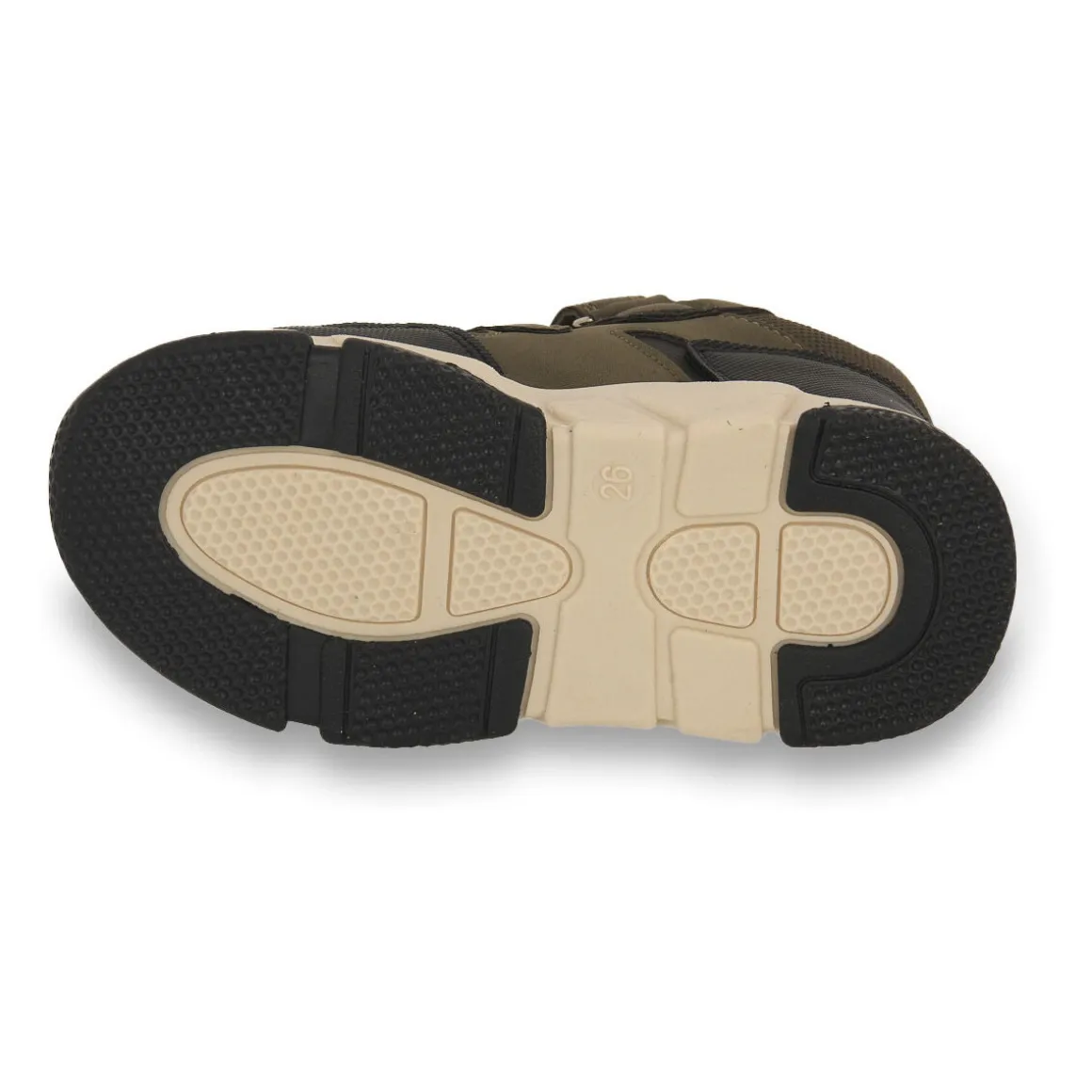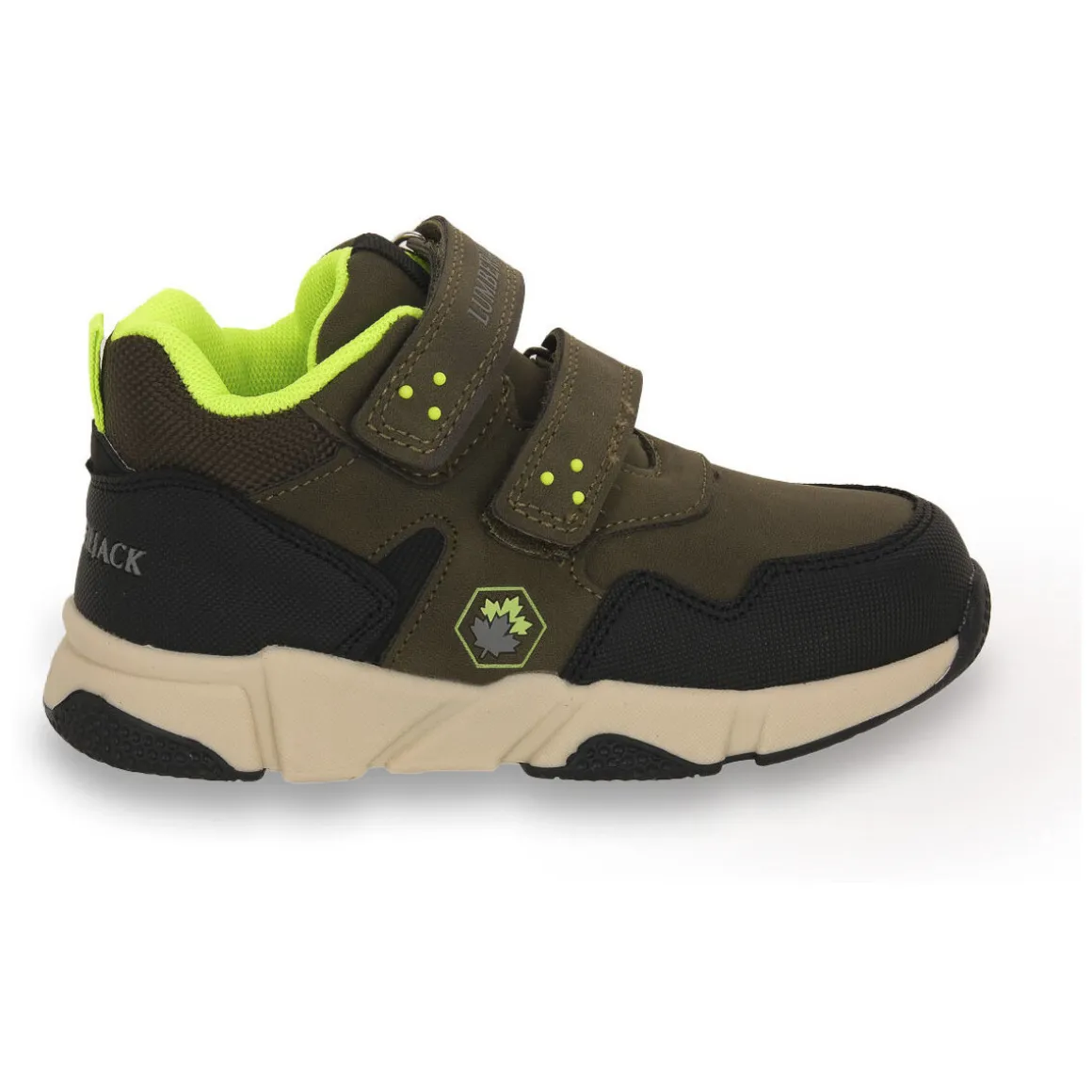 Baskets pour enfants en cuir synthétique et tissu, semelle intérieure en mesh amovible. Chaussures à deux velcro adaptées aux activités quotidiennes. Couleur : vert militaire.
