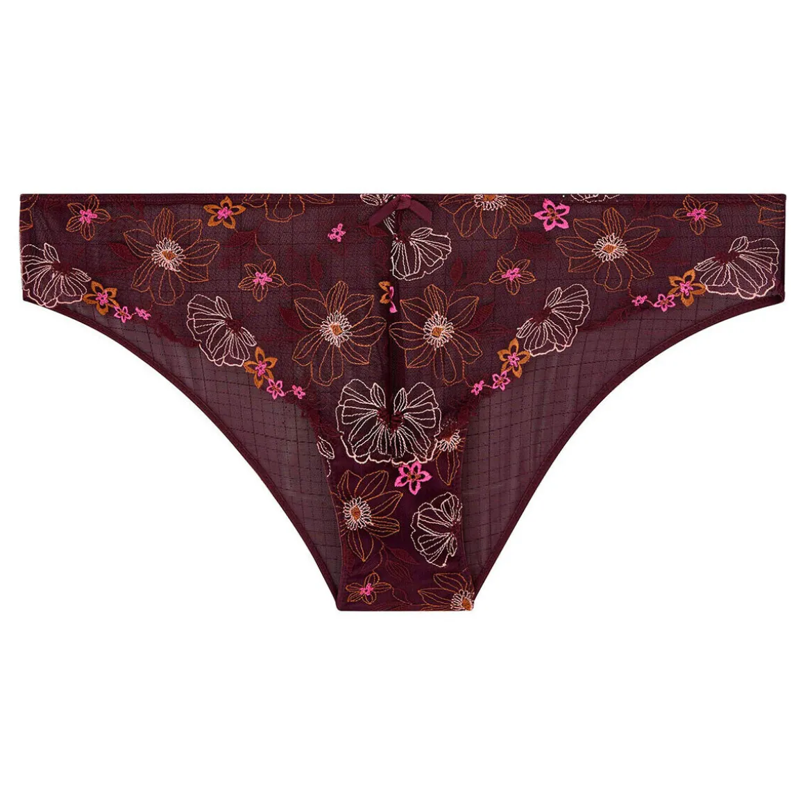Slip en tulle brodé au motif fleurs. Petit nœud à la ceinture élastiquée. Fond doublé d’un gousset 100% coton. Disponible du 36/38 au 46/48.