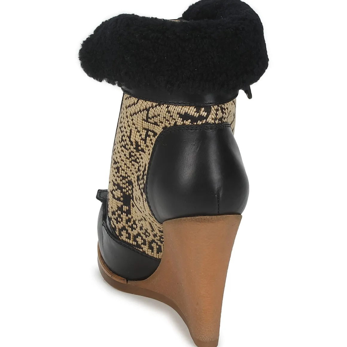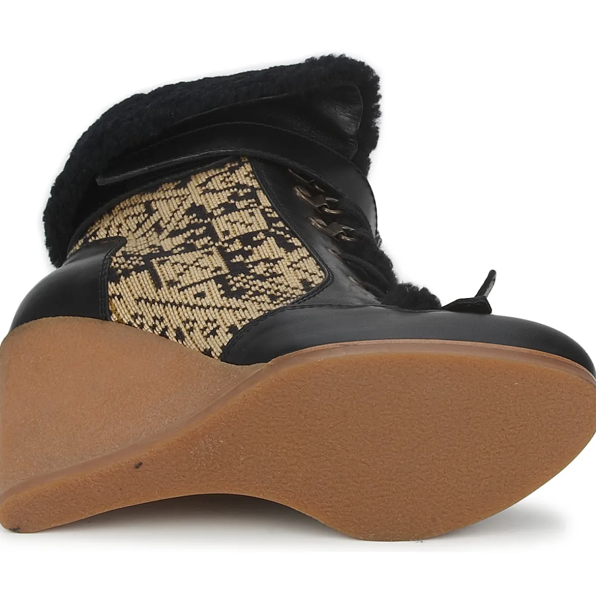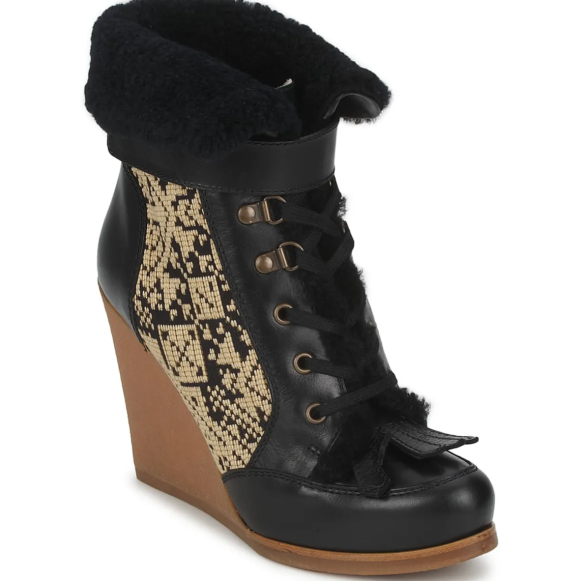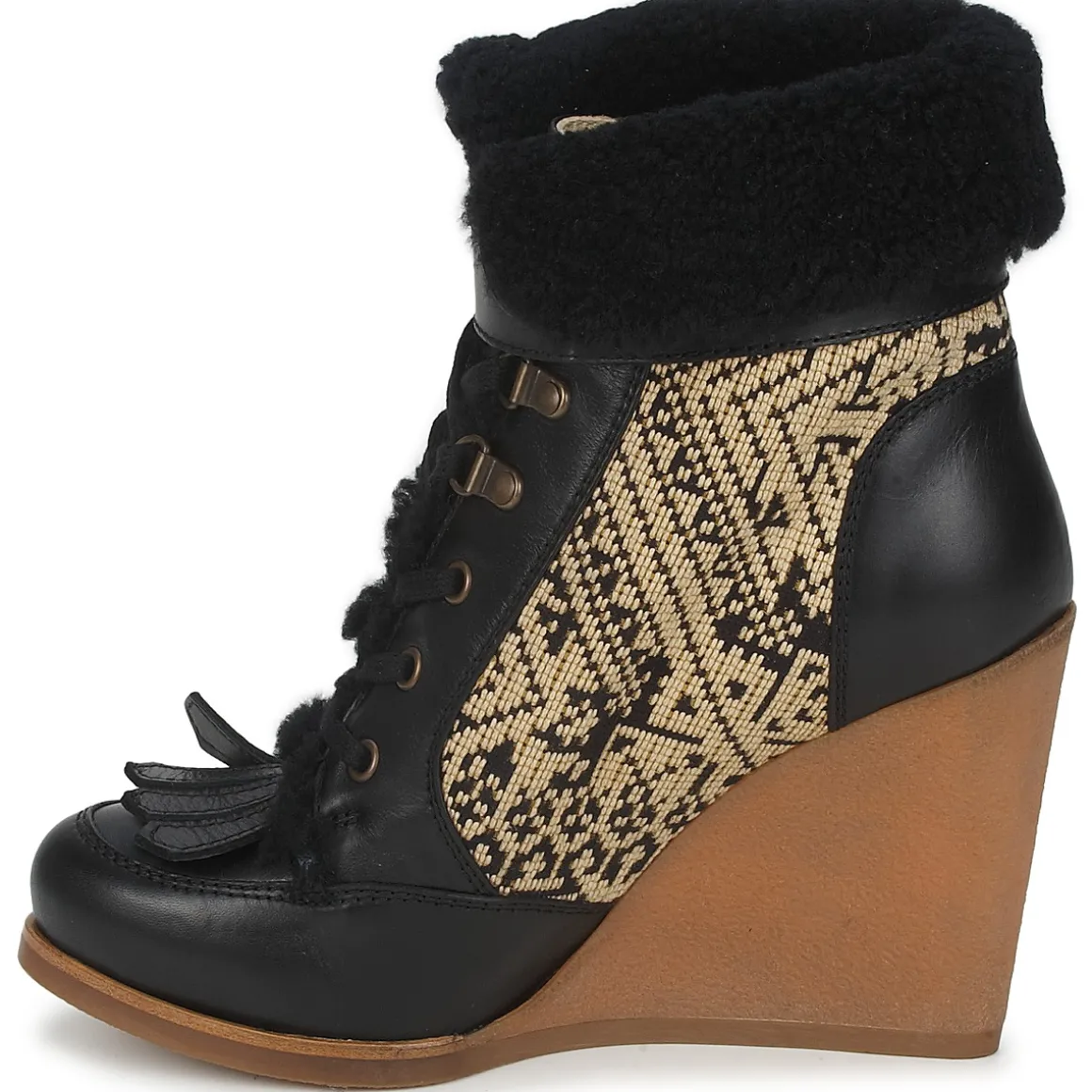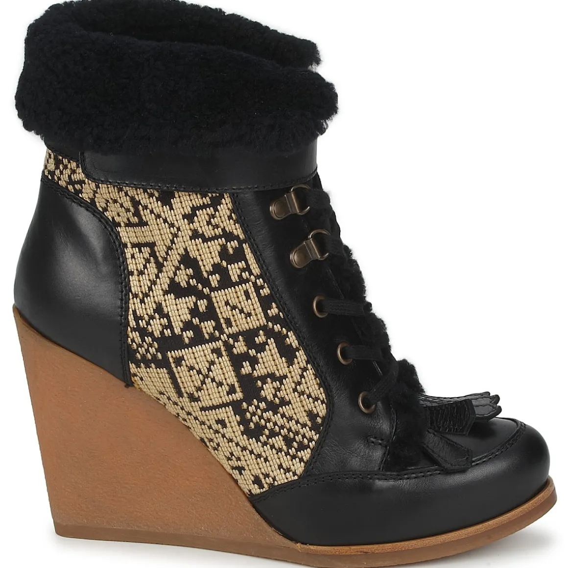 Bottine à lacets pour femme issue de la nouvelle collection Automne-Hiver Etro. Conception en veau lisse et tissu. Revers en fourrure de bélier. Cale recouverte en crêpe naturelle.