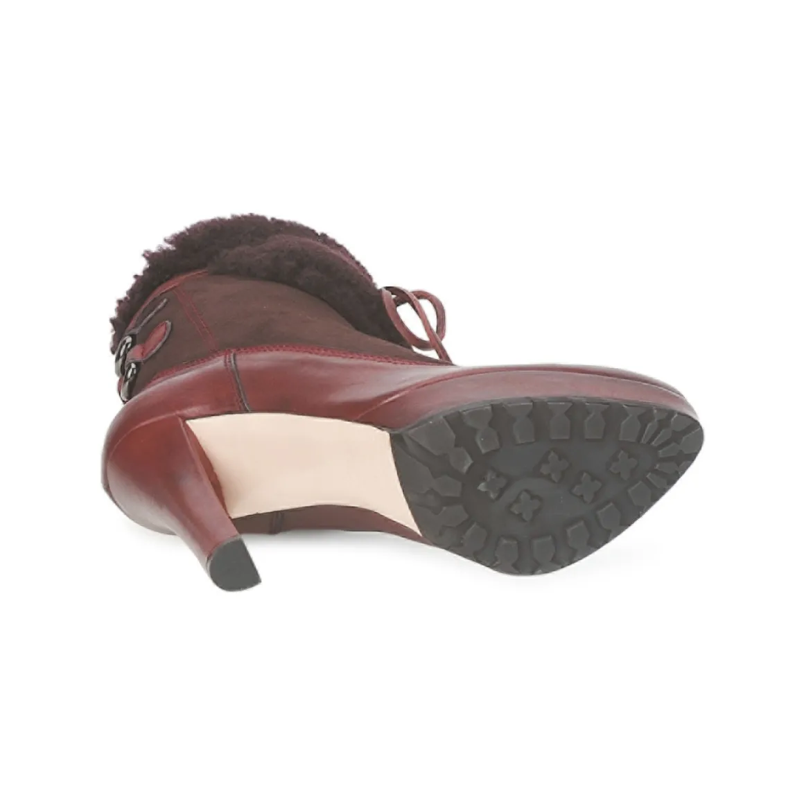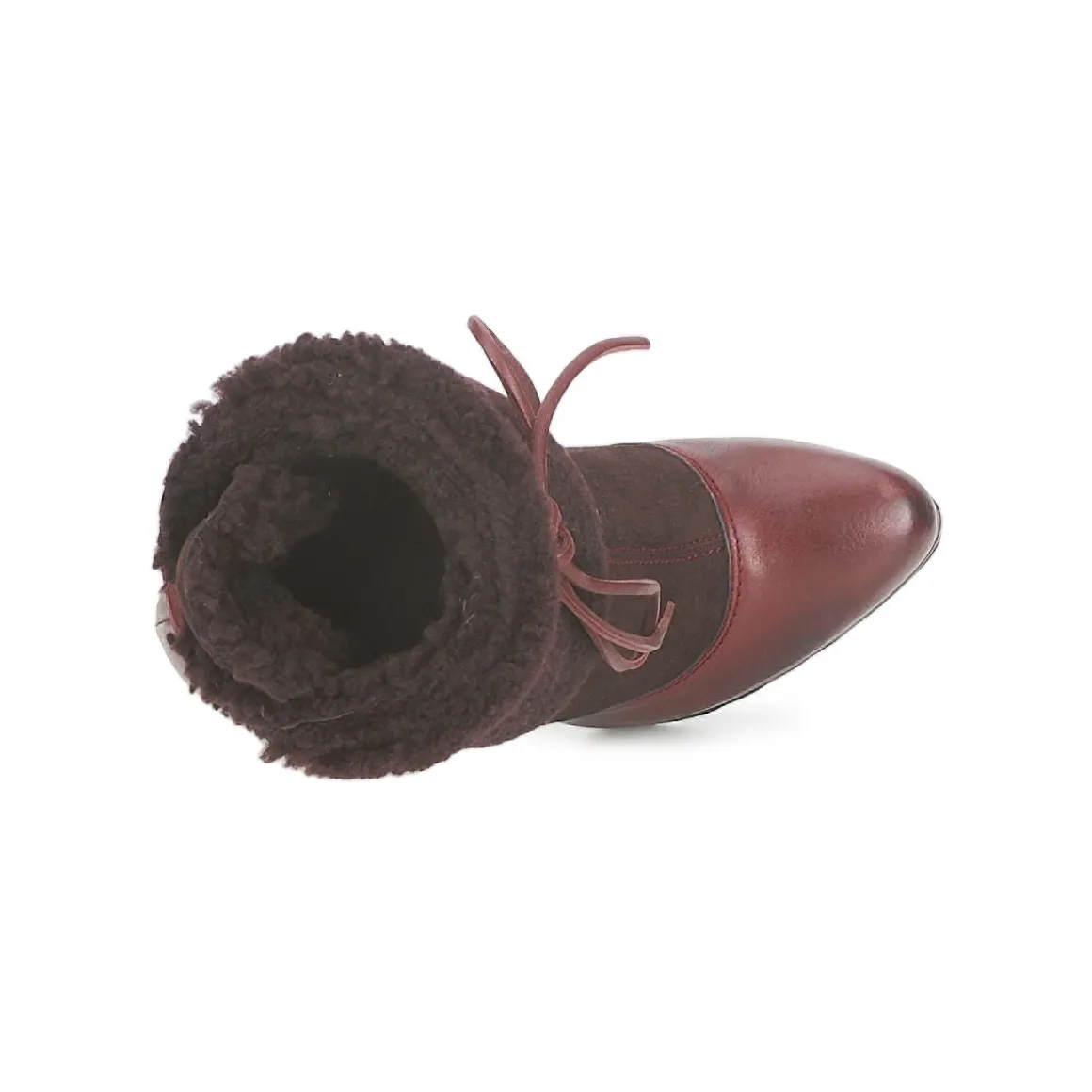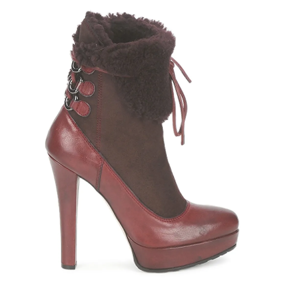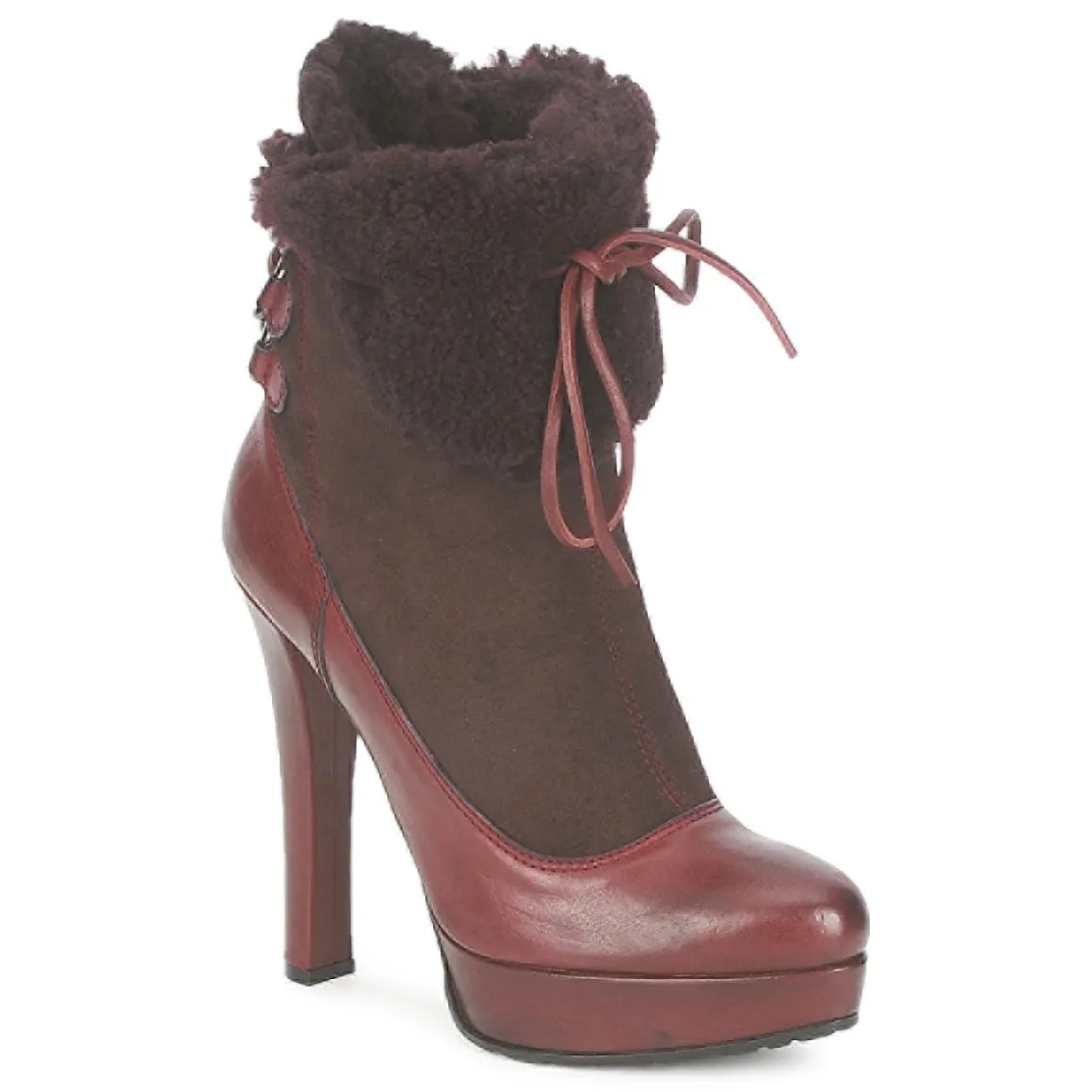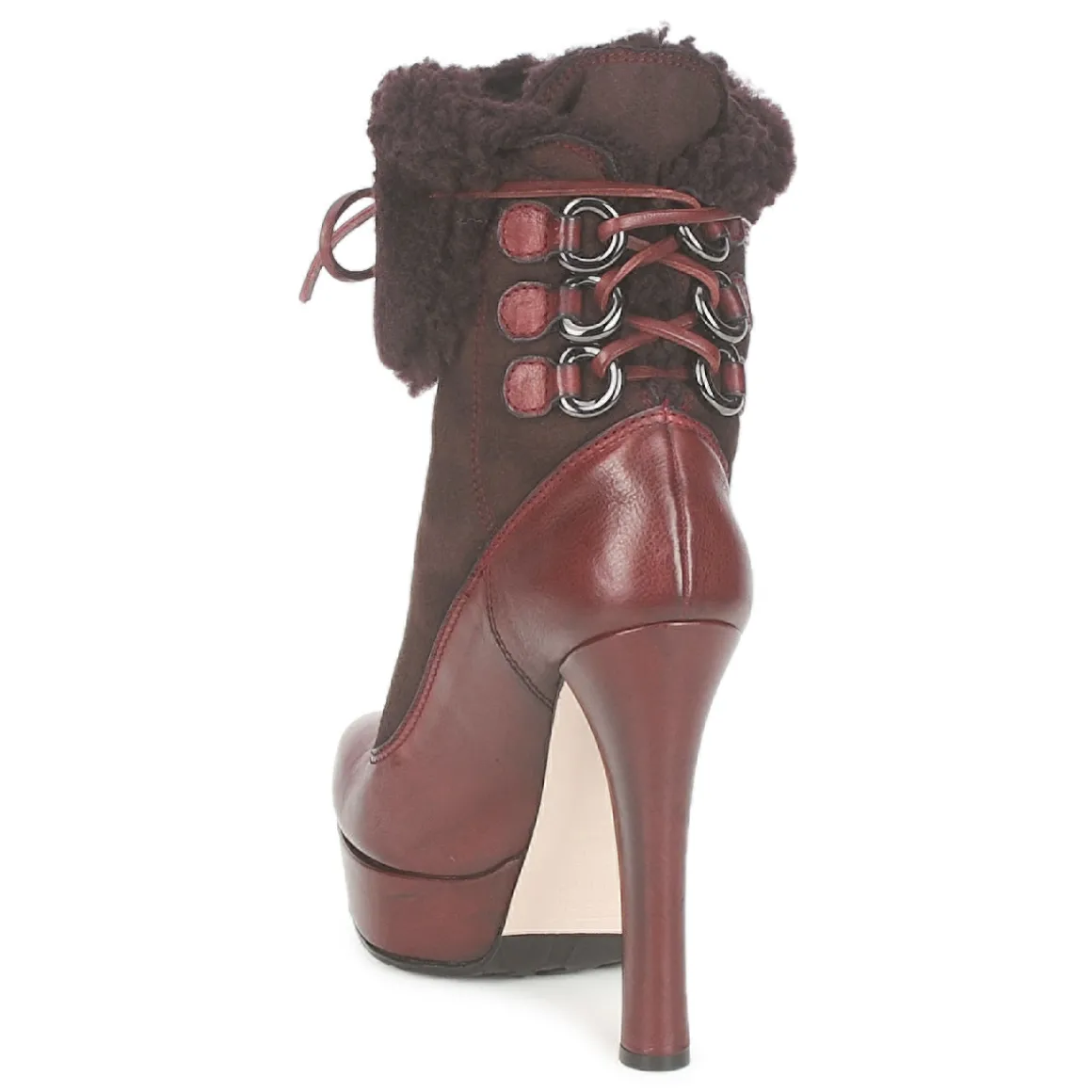 Bottine Sebastian donnant l’illusion d’un escarpin en trompe l’oeil. Revers molletonné avec laçage sur l’arrière passant dans des anneaux en métal et se nouant sur le devant. Belle hauteur de talon adoucie par la présence d’un plateau avant. Semelle crantée antidérapante.