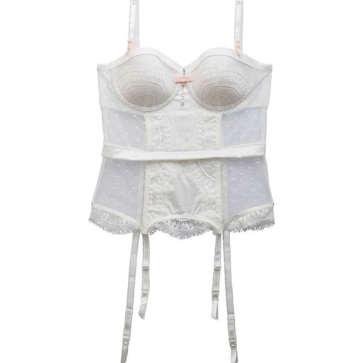 Guêpière armatures coques. Décolleté pulpeux et plongeant, finition forme bandeau . Dentelle florale ajourée texturée effet de cils. Microfibre satinée et tulle plumetis. Bretelles fantaisie fines détachables et réglables. Noeuds en satin et perles aux départs de bretelles. Bijou perles amovible à l’entre-seins. Galon satinée à la taille. Jarretelles réglables. Finition en dentelle en bas de guêpière. Fermeture 11 agrafes, 3 positions. Disponible du 85B au 95D