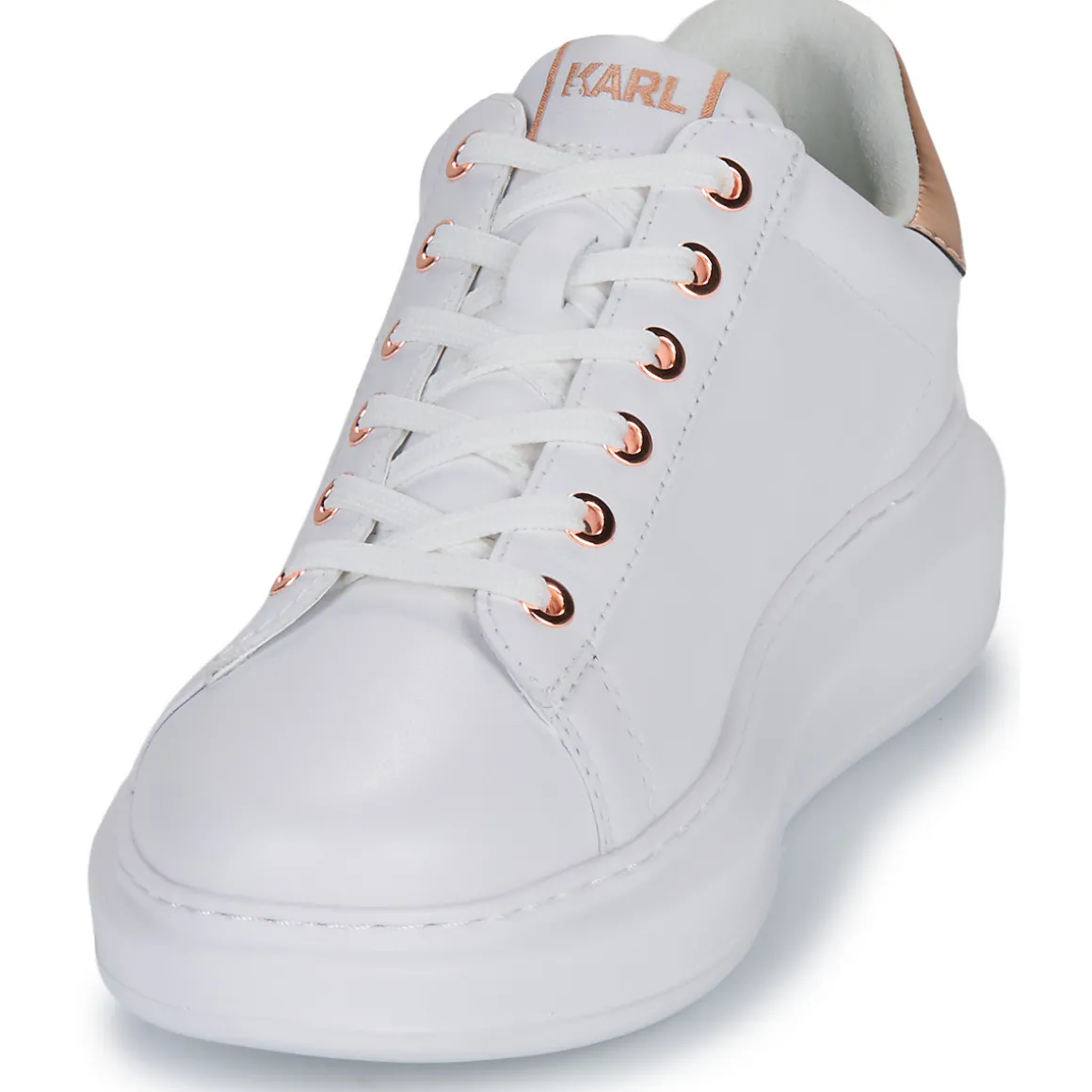 Karl Lagerfeld nous séduit une fois de plus avec cette basket basse. Aussi tendance que confortable, elle associe coloris blanc et dessus en cuir ovin. La Kapri Maison Karl Lace, doublée en synthétique et textile, est montée sur une semelle extérieure en caoutchouc. On la retrouve ici féminisée par un talon de 4 cm. Pleine de caractère, comment y résisterait-on ?