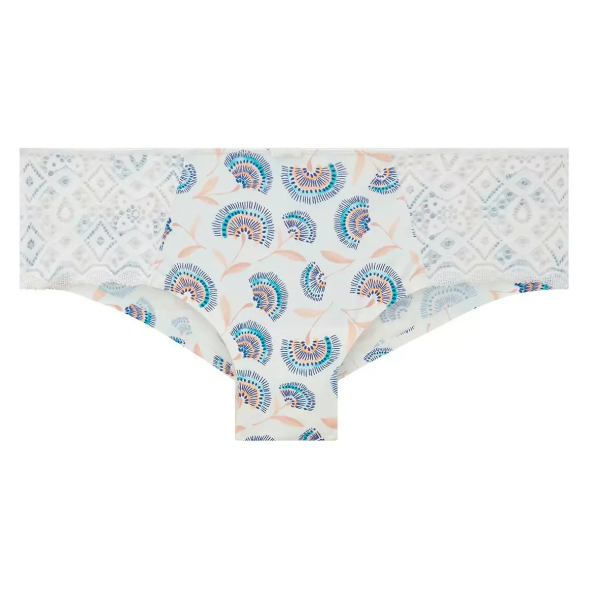 Shorty en dentelle graphique et microfibre. Finitions thermocollées. Petit nœud à la ceinture élastiquée. Fond doublé d’un gousset 100% coton. Disponible du 36/38 au 46/48..