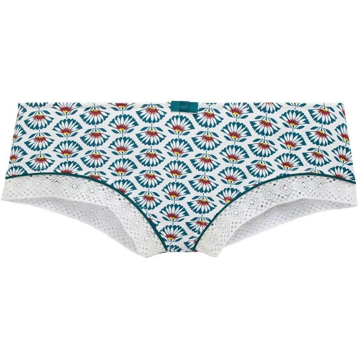 Shorty en microfibre imprimée au motif fleurs ethniques et dentelle géométrique. Galon de dentelle sur l’ouverture des jambes avec piping contrasté. Noeud contrasté en satin à la ceinture. Fond doublé d’un gousset 100% coton. Disponible du 36/38 au 46/48