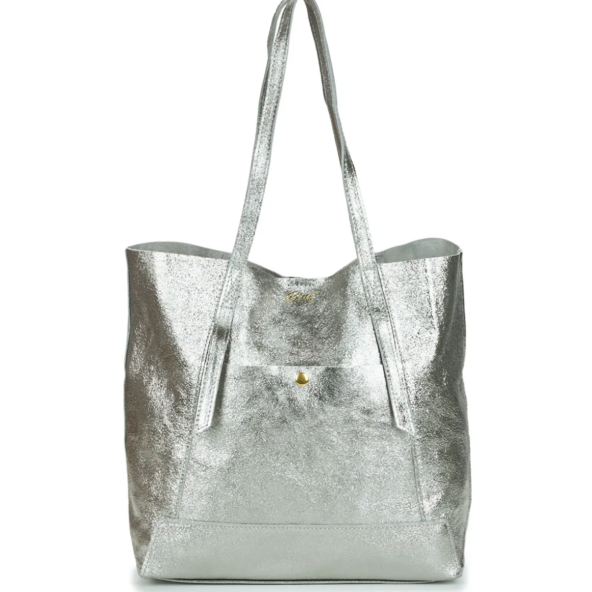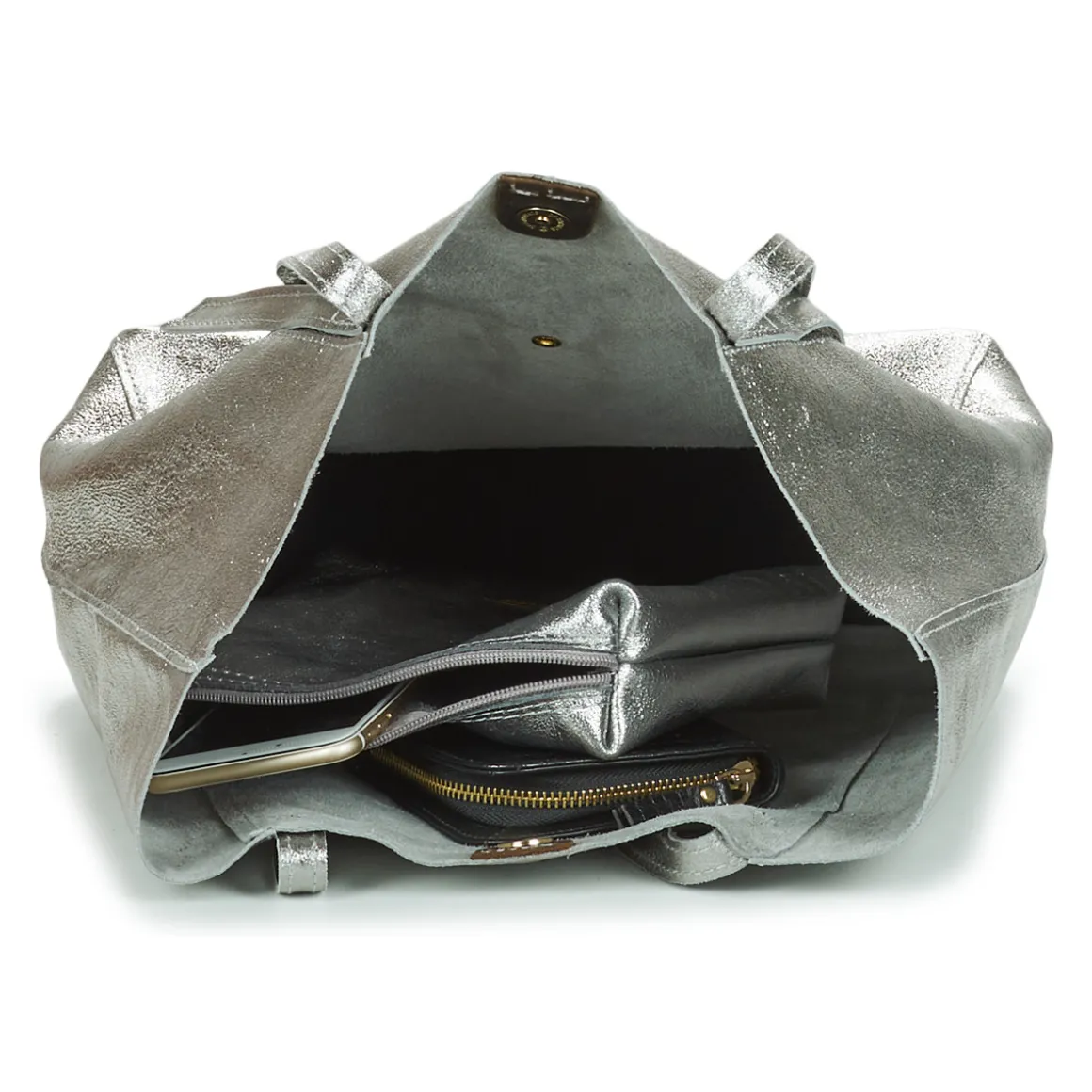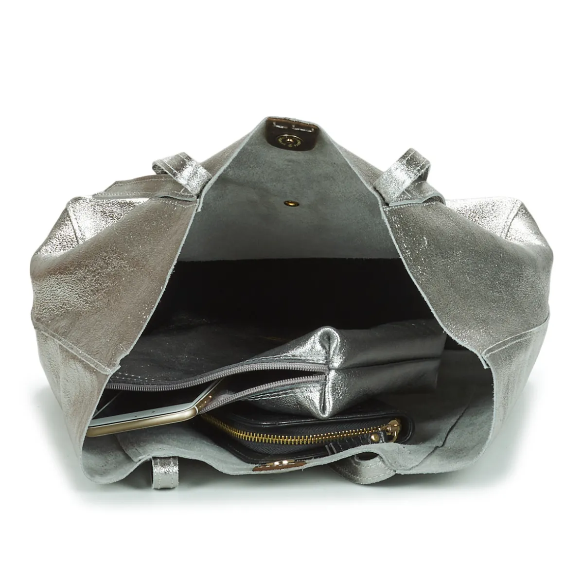 Sac cabas en croûte de cuir de vachette métal / Pochette intérieure amovible zippée / Poche extérieure à l’avant avec bouton de pression / Fermeture avec aimant / Inclus : une pochette en cuir