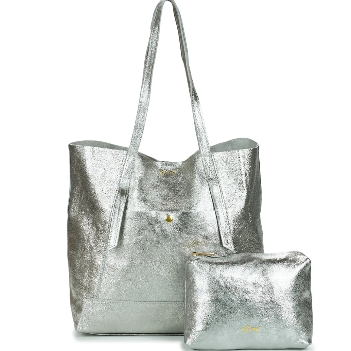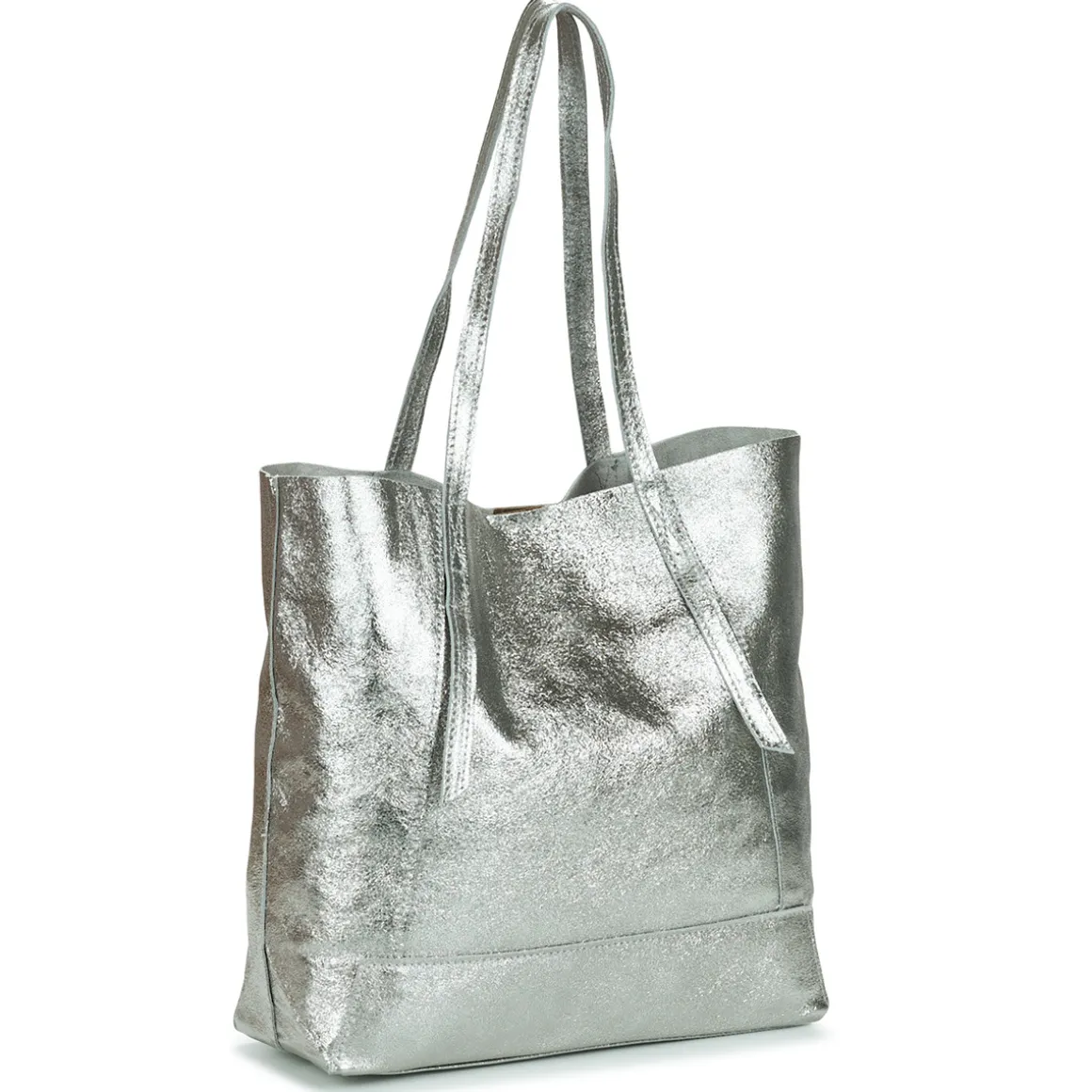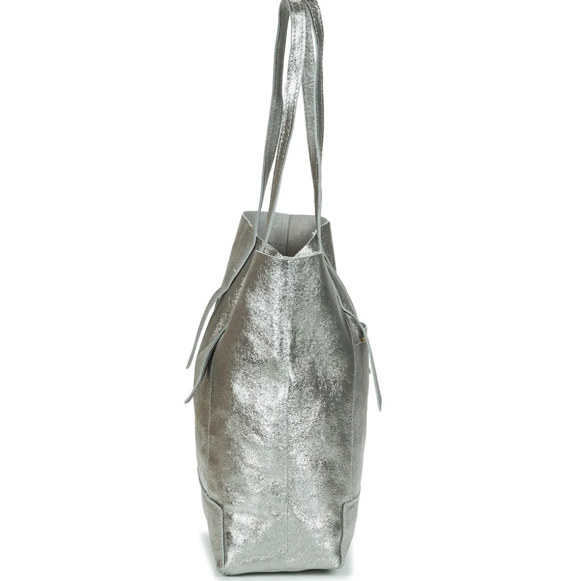 Sac cabas en croûte de cuir de vachette métal / Pochette intérieure amovible zippée / Poche extérieure à l’avant avec bouton de pression / Fermeture avec aimant / Inclus : une pochette en cuir