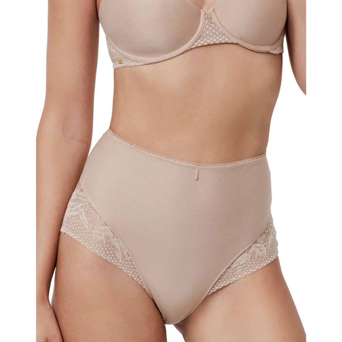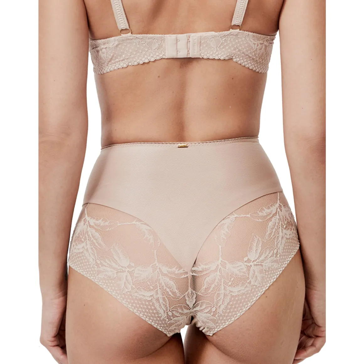 Coupe ceinture taille haute avec détails en dentelle florale sur les côtés et vers l’arrière. Elle possède un tulle de contrôle à l’intérieur qui offre un effet modelant délicat du ventre, très confortable, idéal à porter au quotidien. Gousset en coton pour un confort intime garanti. Petit logo dans le dos. Petit bijou fin sur l’avant, petit logo sur l’arrière.