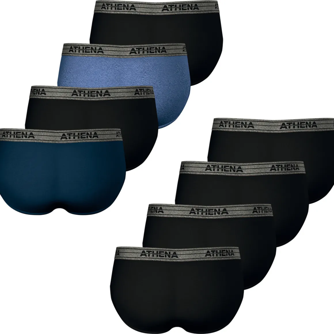 Caractéristiques de ces 8 slips ATHENA ECO PACK : Slips en 100% cotonCoupe slip classiqueSlips doublés devantLot de 8 slips ATHENA ECO PACK vendus en boîte : 6 slips noirs, 1 slip bleu chiné et 1 slip bleuVendu uniquement sur le webSlips ECO PACK ATHENA : la qualité accessible.