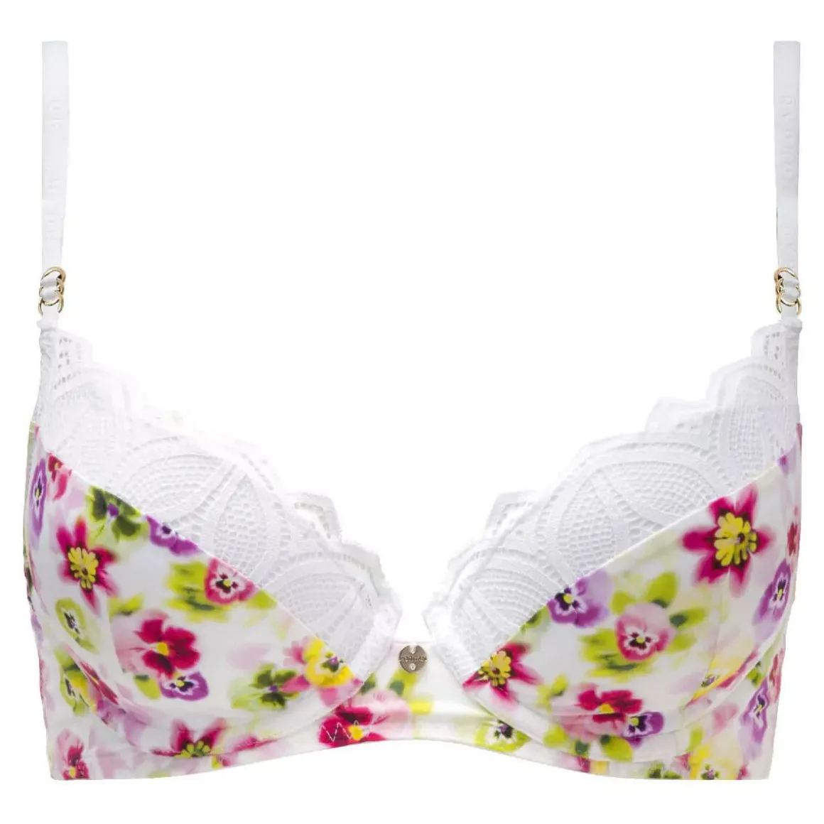 Soutien-gorge coques moulées. Décolleté classique. Microfibre recyclée imprimée au motif floral aquarellé. Contient 7% de matières recyclées. Dentelle graphique recyclée. Bretelles fines et réglables embossées Morgan. Médaille logotée Morgan à l’entre-bonnets. Anneaux dorés aux départs de bretelles. Fermeture dos : 2 agrafes, 3 positions. Disponible du 85A au 95C.
