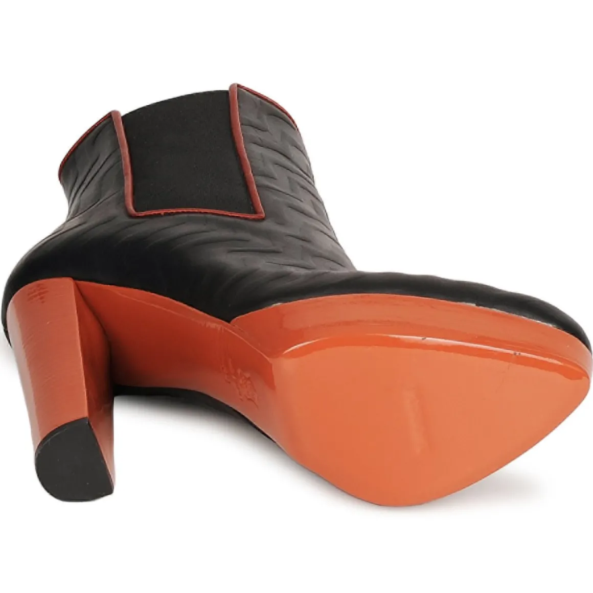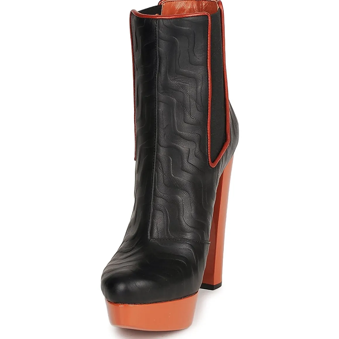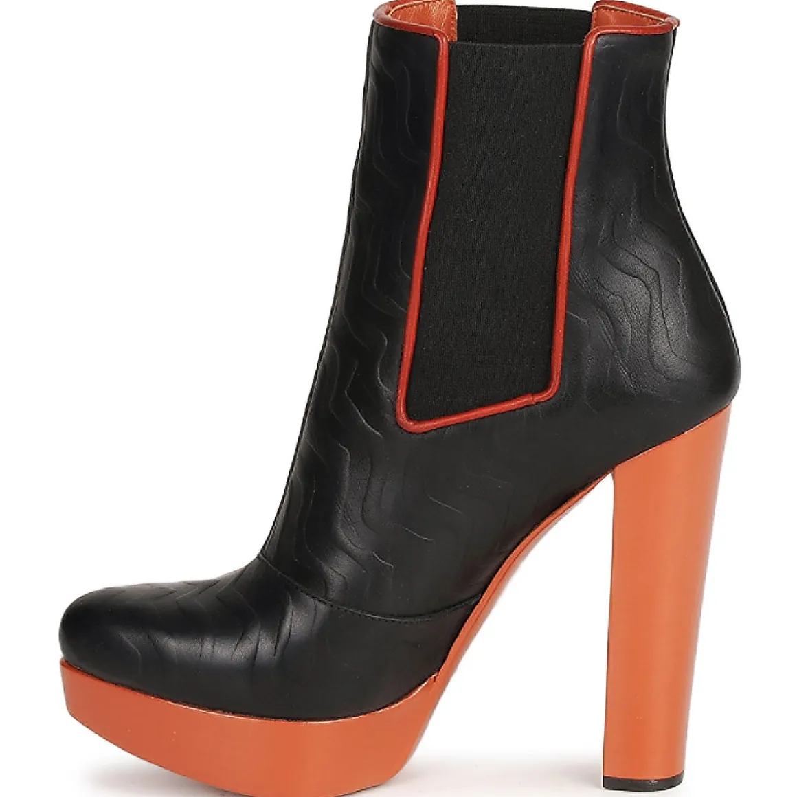 Bottine Missoni en cuir de veau. Motif en zigzags à travers un effet gaufré. Elastiques d’aisance situés de chaque côté pour un enfilage en confort. Belle hauteur de talon adoucie par la présence d’un plateau avant. Doublure et semelle intérieure en cuir de veau.