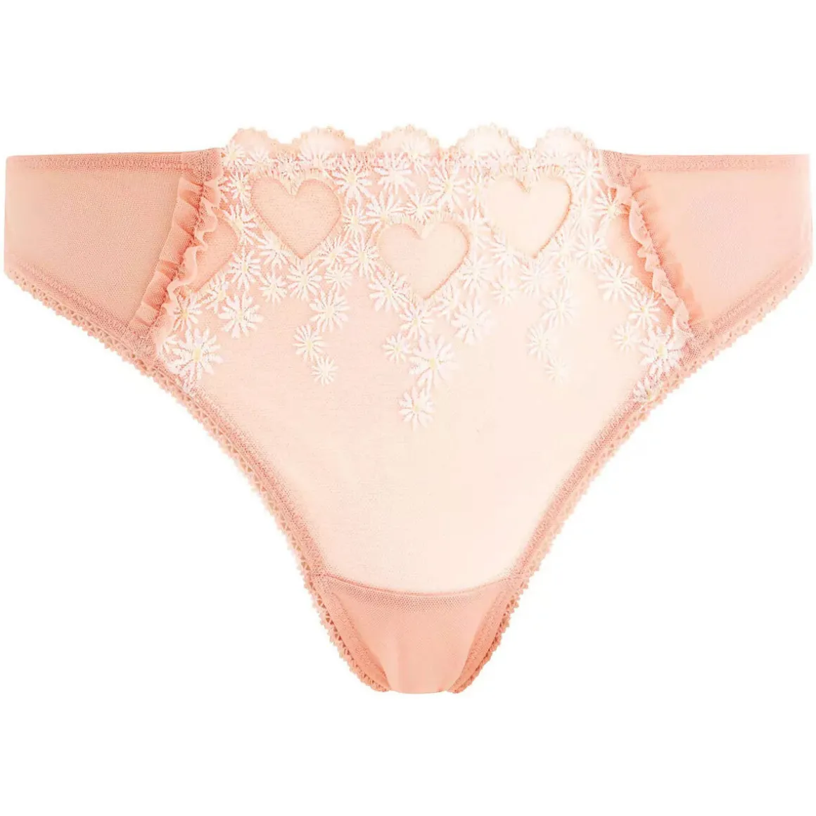 Tanga en tulle brodé motif coeur et petites marguerites et tulle. Fond doublé d’un gousset 100% coton. Disponible du 36 au 44.